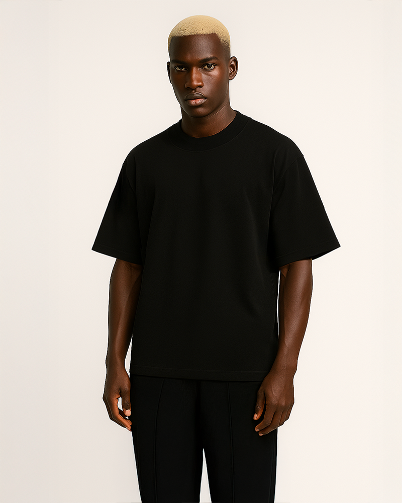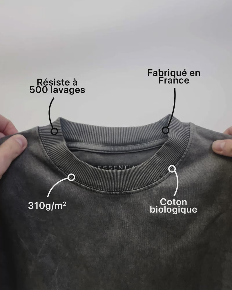 L'atelier Français source son coton en Grèce. Celui-ci est ensuite tricoté à Barcelos. Une fois les rouleaux de tissus prêts, ils sont envoyés dans notre atelier à Aubervilliers pour procéder à la coupe et au montage des pièces. L'impression de l'étiquette au col et les dernières finitions sont réalisées ici même.